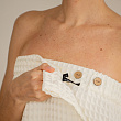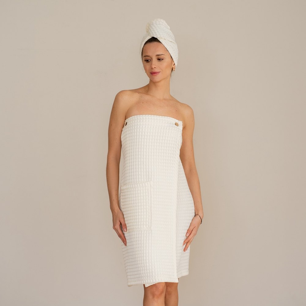 Банный килт из натурального вафельного полотна. Надежно фиксируется на теле кокосовыми пуговицами. Килт быстро высыхает, подходит для использования в хамаме, бане, сауне. Простой и уютный, это идеальный выбор для вашей ванной комнаты. Дополните килт уютными домашними тапочками, чалмой и косметичкой для банных принадлежностей из нашей коллекции "Тори". Состав - 100% Хлопок.