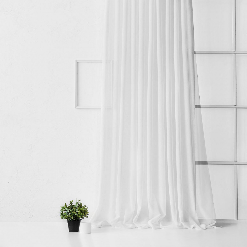 Прямая однотонная портьера на прозрачной шторной ленте из легкой фактурной ткани, имитирующей натуральную. Состав - 100% полиэстер.