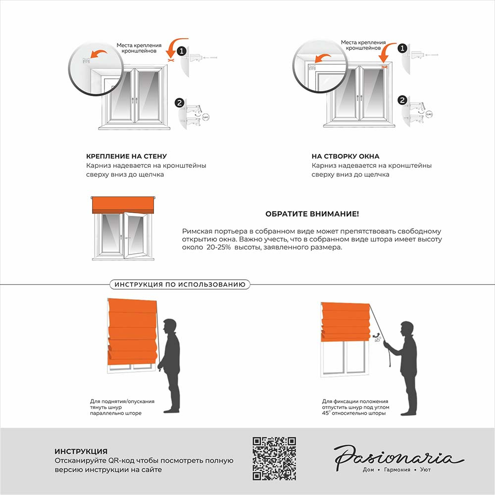 Римские шторы "Билли" выполнены из хлопкосодержащей ткани. Состав - 65% хлопок, 35% п/э. Размерный ряд: ширина 60 см, 80 см, 100 см, 120 см, 140 см, 160 см. Длина 150 см. Штора поставляется в собранном виде на карнизе. Все необходимые крепления и инструкция входят в комплект. Римскую штору можно крепить 4 способами: в оконный проем, на створку окна, на стену и на потолок. Сделано в России.