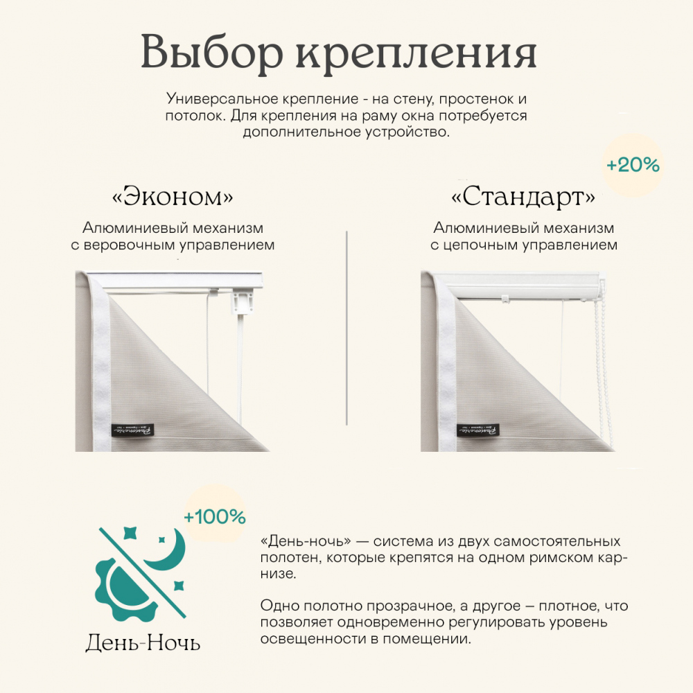 Римские шторы "Тина" выполнены из ткани софт. Состав - 100% п/э. Размерный ряд: ширина 60 см, 80 см, 100 см, 120 см, 140 см, 160 см. Длина 175 см. Штора поставляется в собранном виде на карнизе. Все необходимые крепления и инструкция входят в комплект. 4 способа монтажа: в оконный проем, на створку окна, на стену и на потолок. Сделано в России.