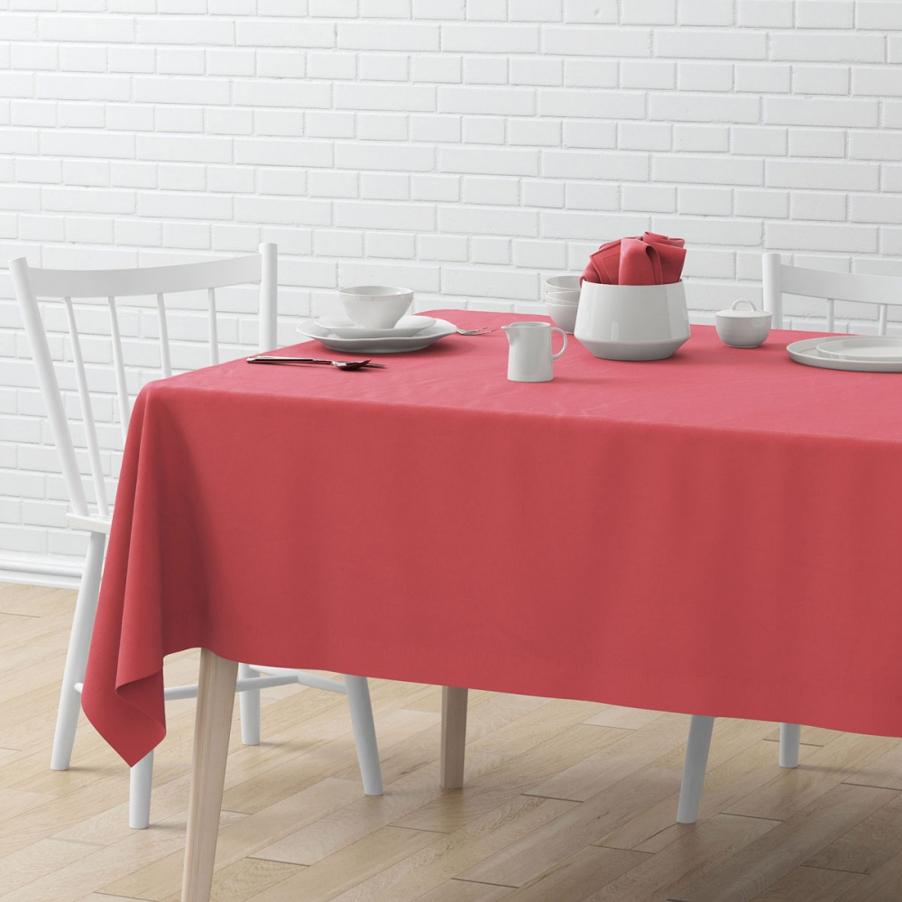 Текстильная скатерть из декоративной ткани. Состав ткани - 65% Хлопок/35% Полиэстер. Обработка края - "евроуголок" (прямоугольная) и "косая бейка" (круглая). Плотность ткани 215 г/м2.